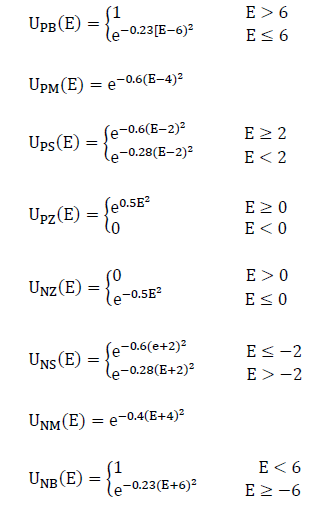 例如:描述偏差E 的八個(gè)模糊狀態(tài)與相應(yīng)論域間的符合程度可用下列八個(gè)隸屬函數(shù)
