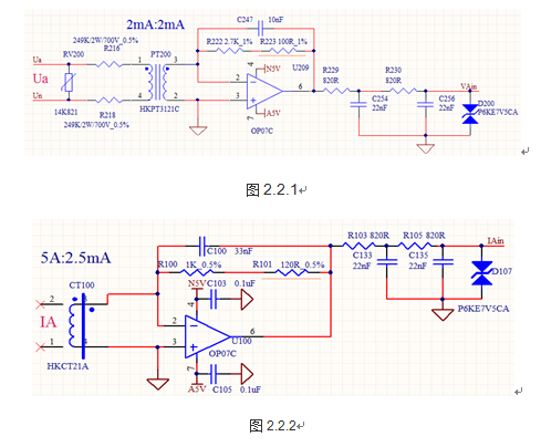 前端采樣電路如圖2.2.1和圖2.2.2所示,電壓電流采樣選用高精度電壓電流互感器,其體積小、精度高、全封閉、隔離耐壓能力強(qiáng)?;ジ衅鲗㈦妷弘娏鬓D(zhuǎn)換為小信號后,經(jīng)二階低通濾波送至AD芯片進(jìn)行轉(zhuǎn)換。AD芯片選用高精度16位AD芯片ADS8568SPMR,基準(zhǔn)電壓2.5V,8通道同步采樣,轉(zhuǎn)換速率滿足系統(tǒng)對快速采樣轉(zhuǎn)換的需求,且信噪比達(dá)到91.5dB。