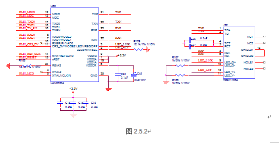 以太網(wǎng)通信接口采用片上以太網(wǎng)外設(shè)通過簡化介質(zhì)獨(dú)立接口 (RMII)和外部快速物理層LAN8720A芯片實(shí)現(xiàn),RJ45接口內(nèi)部集成了1:1變比的信號變壓器,實(shí)現(xiàn)信號的隔離保護(hù),提高通訊的抗干擾性能,具體實(shí)現(xiàn)原理如圖2.5.2所示。