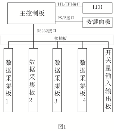 觸摸式無(wú)紙記錄儀主要由主板、按鍵板、數(shù)據(jù)采集板、開關(guān)量輸入、輸出板、液晶屏、觸摸屏、液晶驅(qū)動(dòng)板、電源板、轉(zhuǎn)接公共板等組成。按鍵面板通過PS/2接口與主板連接,LCD通過TFT接口與主板連接,主板的RS232接口連接到轉(zhuǎn)接板,再通過轉(zhuǎn)接板和各采集板和開關(guān)量輸入輸出板連接,構(gòu)成了多個(gè)RS232通信電路。
