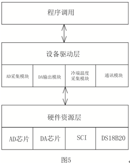 采集板數(shù)據(jù)驅(qū)動(dòng)程序包括AD采集模塊、DA輸出模塊、冷端采集模塊、通訊模塊等,不同的模塊在程序中有各自的頭文件和源文件,采用模塊化結(jié)構(gòu)的模塊可以提高代碼的重用率,只要修改少量代碼就可以完成程序的移植,在程序中只需要調(diào)用各公共的接口函數(shù)就能對(duì)設(shè)備進(jìn)行操作,這樣一來系統(tǒng)軟件的層次分明,便于維護(hù)和調(diào)試。