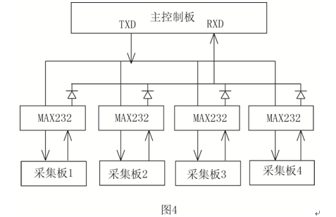 主控制板與采集板之間的通信電路采用主從總線拓?fù)浣Y(jié)構(gòu),以主控制板為主機(jī),采集板為從機(jī),每塊采集板的通信接口與RS232芯片連接,為防止輸出端電平相互影響,在從機(jī)的發(fā)送端和主機(jī)的接收端之間串入一個(gè)二極管。為保證機(jī)和從機(jī)正常的傳送數(shù)據(jù),需要有一套完整的信息傳輸模式,數(shù)據(jù)格式以及內(nèi)容的規(guī)約協(xié)議。主機(jī)向所有從機(jī)發(fā)送帶地址信息的指令報(bào)文,被尋址從機(jī)根據(jù)指令報(bào)文中功能碼做出應(yīng)答或動(dòng)作,每個(gè)從機(jī)都有各自的獨(dú)立的地址,主機(jī)向從機(jī)發(fā)送的各種指令報(bào)文和從機(jī)所發(fā)的報(bào)文都是以從機(jī)的地址為開頭的,從機(jī)只讀取發(fā)給自己的指令,對(duì)以其它從機(jī)開頭的報(bào)文不做應(yīng)答。