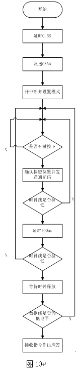 按鍵延遲0.5S后向主板發(fā)送0XAA通知主板。開總中斷、外部中斷,設(shè)置中斷觸發(fā)模式,將時(shí)鐘線、數(shù)據(jù)線連在微處理器的中斷引腳上,掃描鍵盤,看是否有按鍵按下,確定按鍵的位置,發(fā)送相應(yīng)的碼。判斷時(shí)鐘線是否為低電平,如是則延時(shí)100US再判斷時(shí)鐘線是否為低,等待時(shí)鐘釋放,再看數(shù)據(jù)線是否為低,為低則表明主板在請(qǐng)求發(fā)送數(shù)據(jù),根據(jù)主板發(fā)來的指令作出相應(yīng)的應(yīng)答和動(dòng)作。