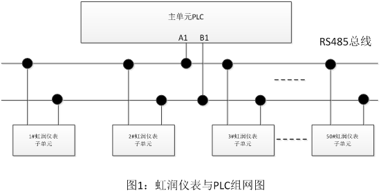 本文利用標(biāo)準(zhǔn)的MODBUS RTU通訊協(xié)議與 RS-485通信指令,方便的實(shí)現(xiàn)與多臺虹潤NHR系列儀表的串行通信.成功的實(shí)現(xiàn)了用單臺控制器對多臺儀表的靈活控制??删幊炭刂破髟试S在一個(gè)RS-485通信接口上連接多達(dá)100臺虹潤儀表,儀表大于60臺時(shí),需加一個(gè)RS-485中繼器,RS-485通信口通信距離長達(dá)1KM以上。