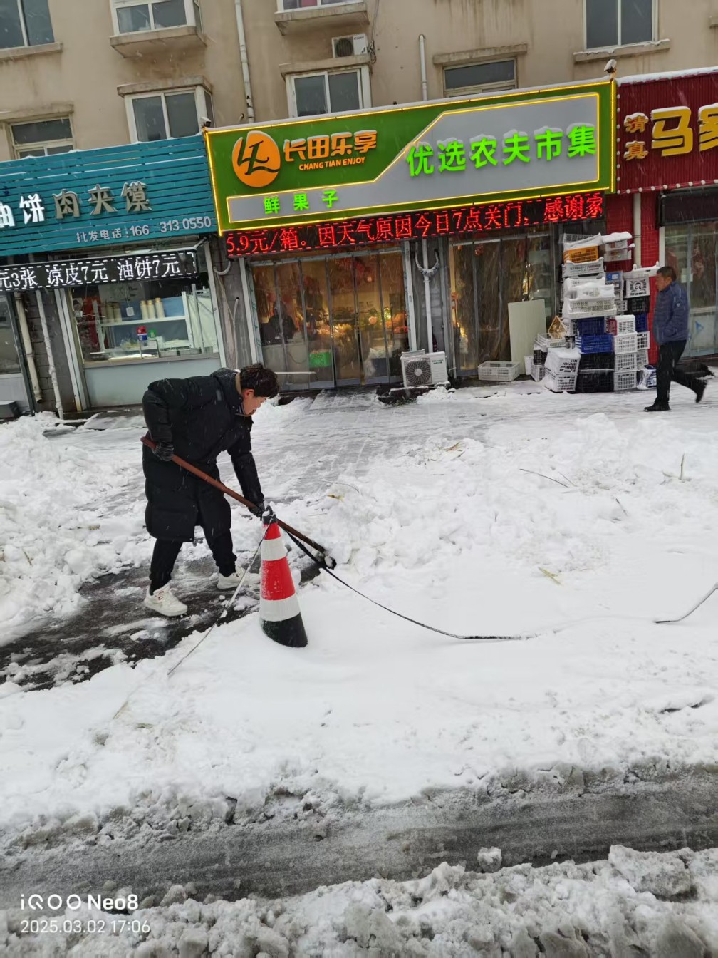 飛雪增寒意,清雪暖人心。3月2日,一場(chǎng)突如其來(lái)的春雪為大地披上了素白銀裝。鵝毛般的雪花紛紛揚(yáng)揚(yáng)下了一整天,道路上的積雪深達(dá)十余厘米,道路濕滑,臺(tái)階結(jié)冰,給出行埋下了安全隱患。面對(duì)極端天氣考驗(yàn),長(zhǎng)田實(shí)業(yè)各業(yè)態(tài)以“雪”為令,迅速響應(yīng),投入到這場(chǎng)與冰雪的“戰(zhàn)斗”中。大家不畏嚴(yán)寒,齊心協(xié)力用實(shí)際行動(dòng)展現(xiàn)長(zhǎng)田人的強(qiáng)大凝聚力和高效行動(dòng)力。