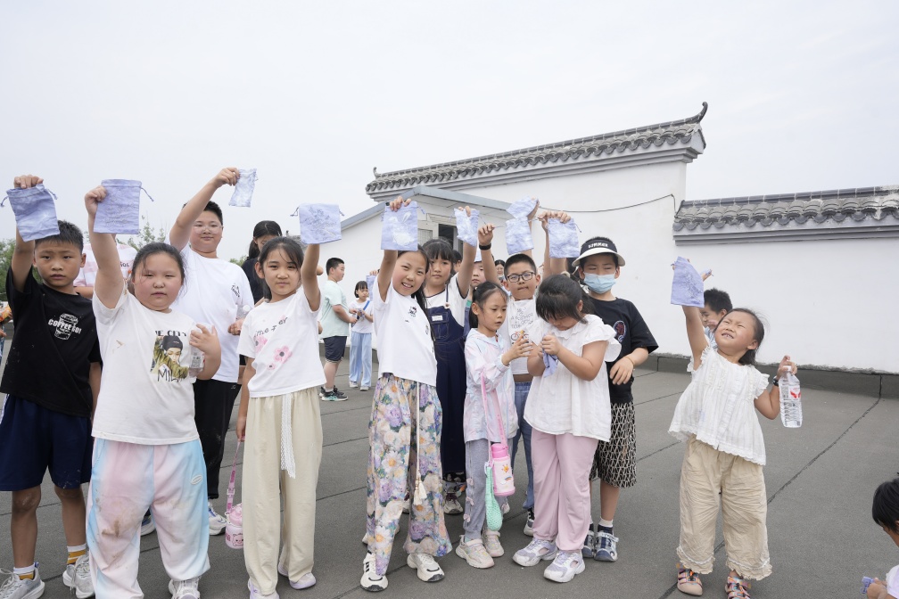 扎染工坊內(nèi),孩子們化身為小小的藝術(shù)家。他們用手中的染料和布料,大膽地揮灑著自己的創(chuàng)意,將原本素白的布料染成藍白相間的圖案,仿佛將天空與大海的美麗濃縮其中。每一塊布料都承載著孩子們的奇思妙想,展示著他們對色彩與美的獨特理解。