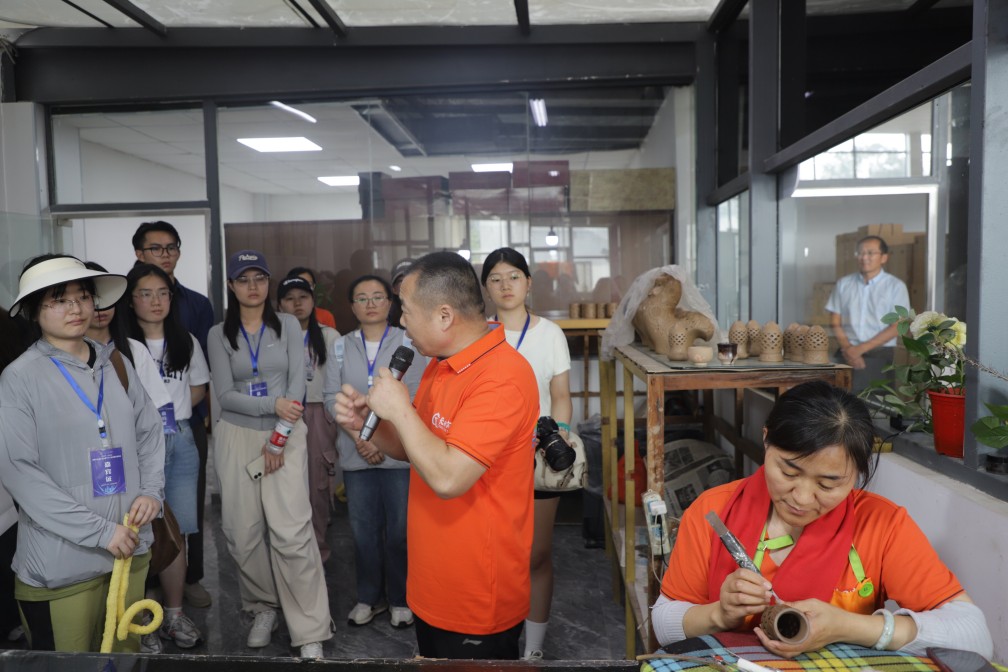 龍格黑陶藝術研究院內,傳統(tǒng)工藝與現代創(chuàng)新的完美融合。省級非物質文化遺產項目代表性傳承人徐慶增老師帶領師生們參觀黑陶生產車間,他特別提到,濟陽黑陶以黃河泥為原料,經選土、拉坯、雕刻、燒制等20余道工序制成,其“黑如漆、亮如鏡”的獨特質感源于高溫窯變的自然反應。現場演示了拉坯、雕刻技藝,手中的陶土仿佛被賦予了生命,在指尖的舞動下逐漸成型。師生們在專業(yè)藝人的指導下,從揉泥、拉坯到成型,親自體驗了黑陶的制作,最終創(chuàng)作出了屬于自己的黑陶作品。