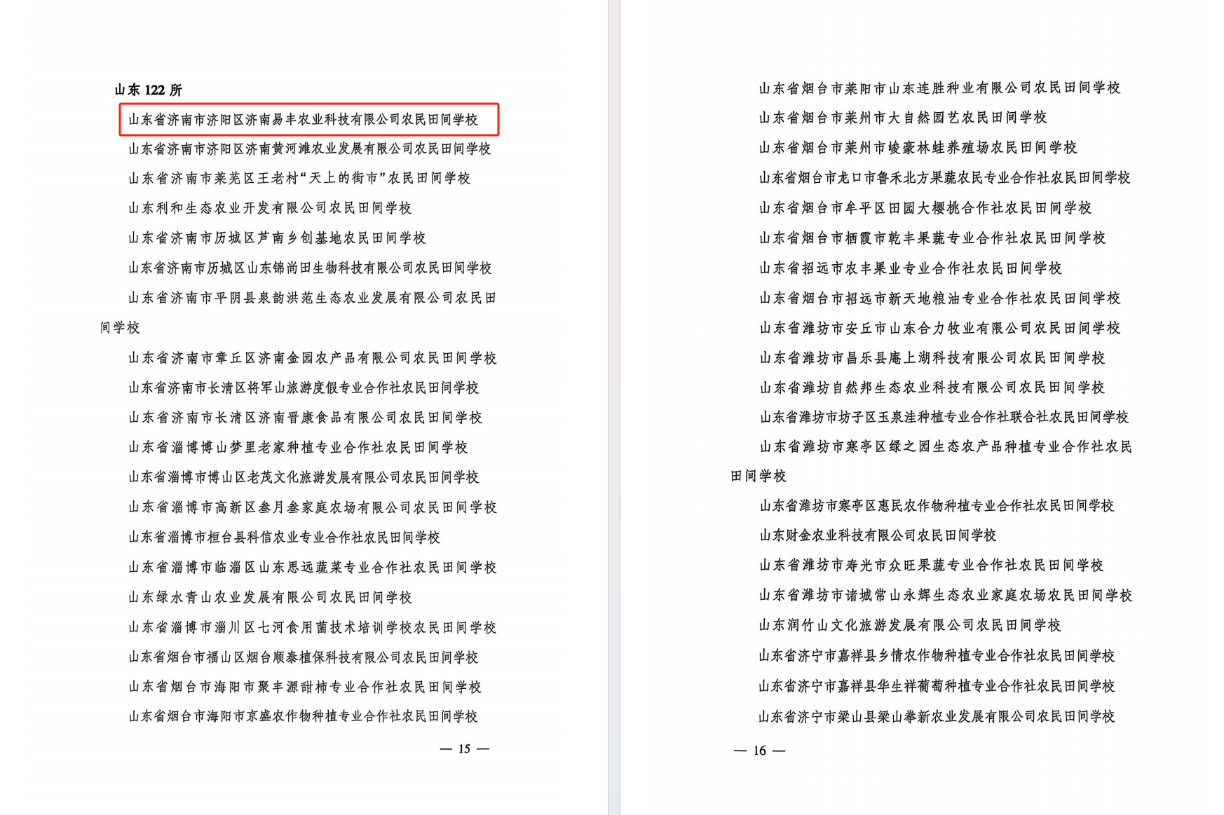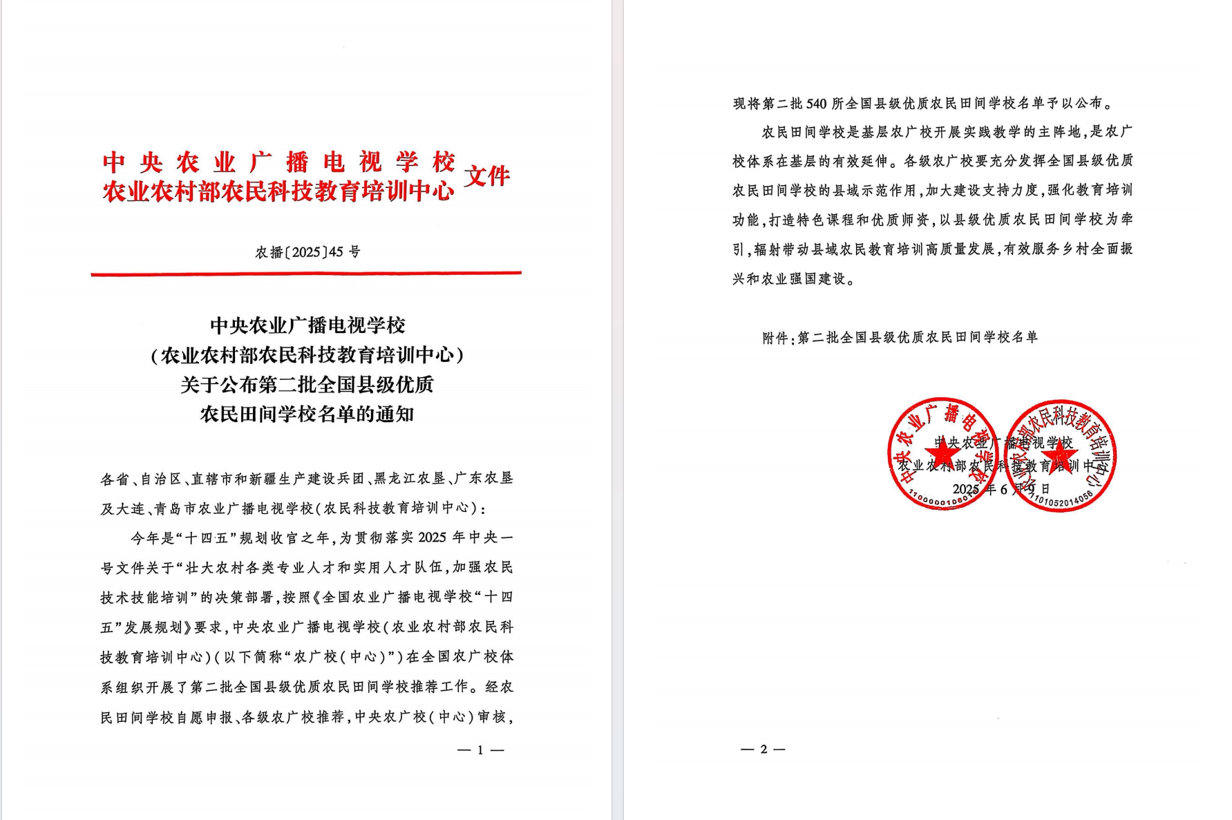 2025年6月9日,中央農(nóng)業(yè)廣播電視學(xué)校(農(nóng)業(yè)農(nóng)村部農(nóng)民科技教育培訓(xùn)中心)公布了“第二批全國縣級優(yōu)質(zhì)農(nóng)民田間學(xué)校名單”。濟(jì)南易豐農(nóng)業(yè)科技有限公司農(nóng)民田間學(xué)校,榮耀上榜,榮獲國家級殊榮!